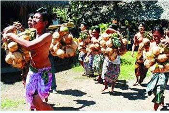 Aktivitas berkebun, khususnya memetik kelapa dan pisang, menjadi bagian utuh dari upacara mesabatan biu yang digelar bagi pemuda setempat.